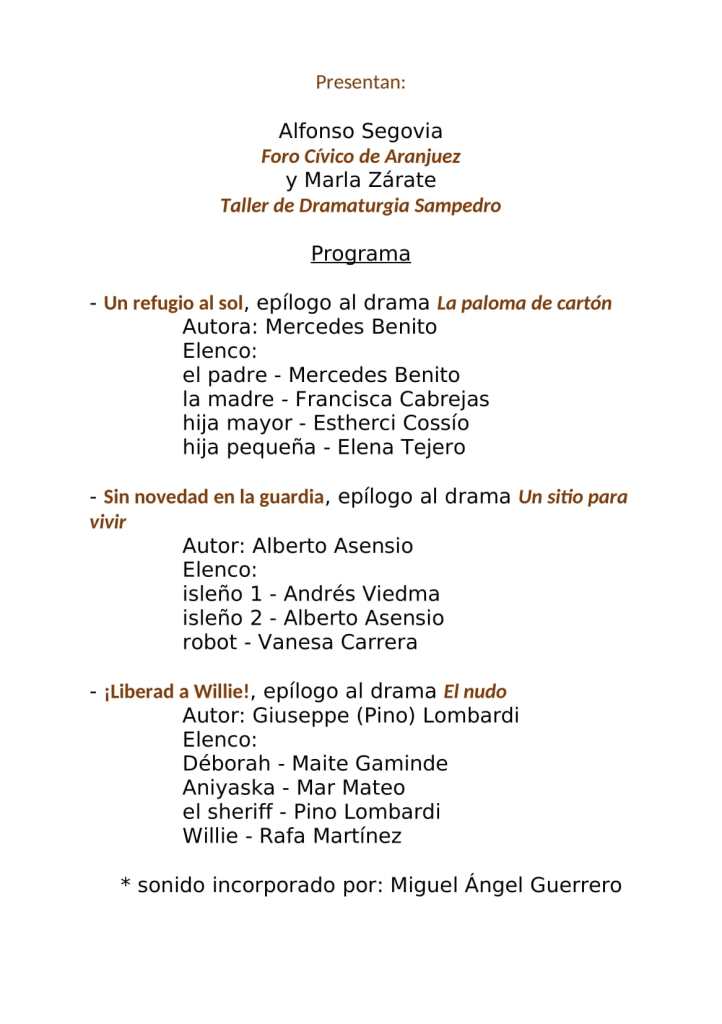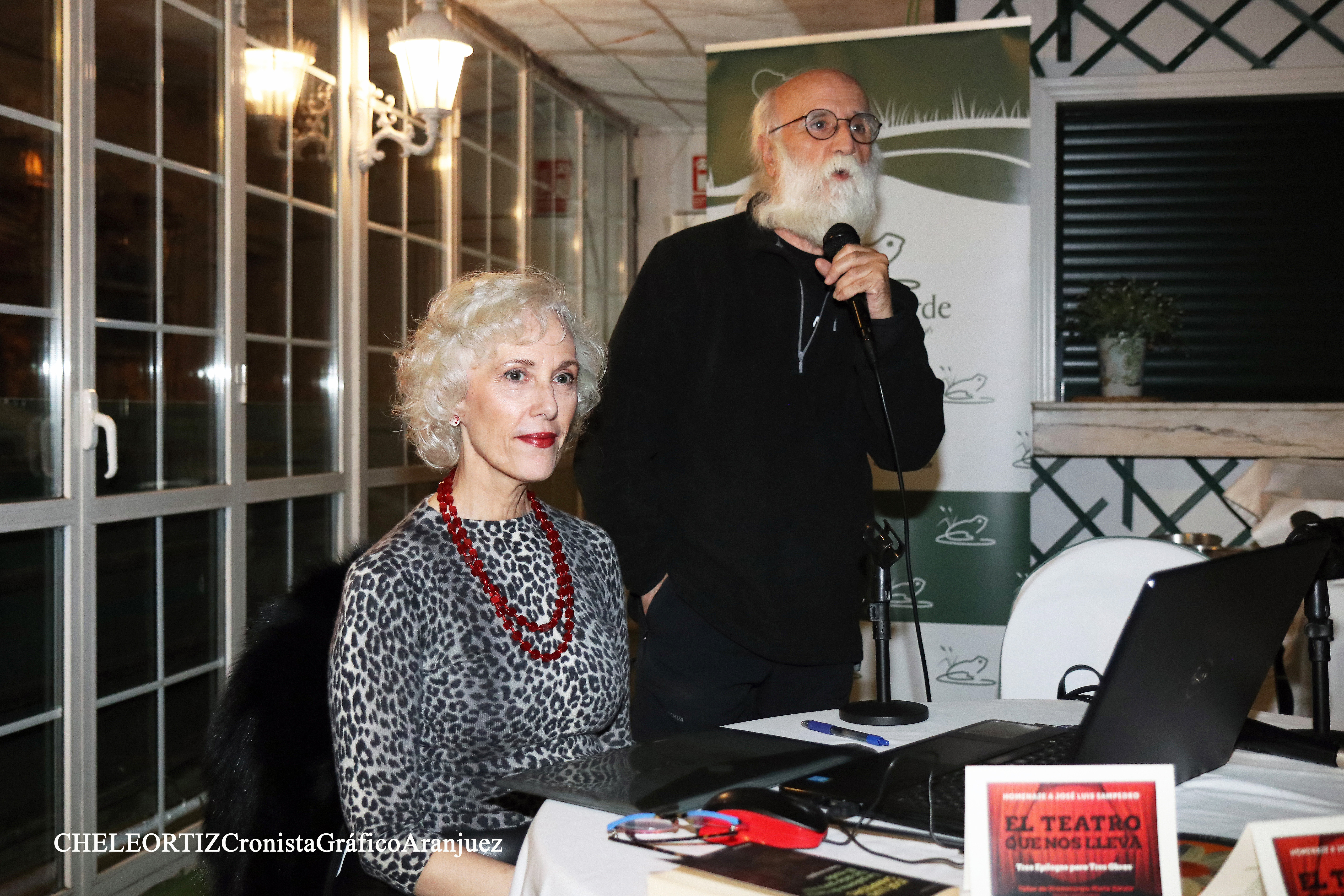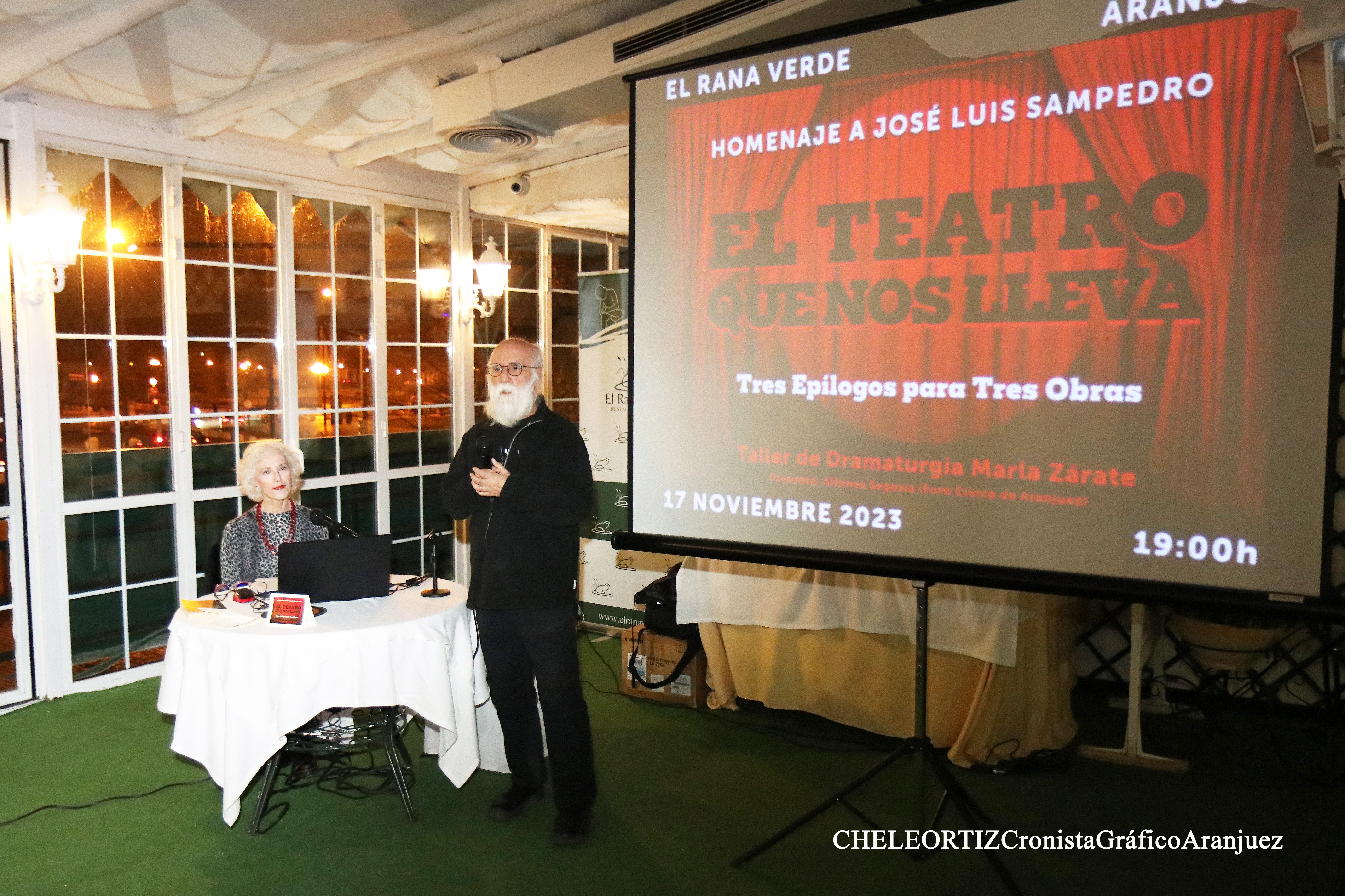 En el décimo aniversario del fallecimiento de José Luis Sampedro le rendimos homenaje en El Rana Verde de Aranjuez presentando tres epílogos a sus tres obras de teatro: La paloma de cartón, Un sitio para vivir y El nudo. Presentaron el acto Alfonso Segovia y Marla Zárate. Isabel Sampedro, como de costumbre, nos acompañó y cerró la velada.