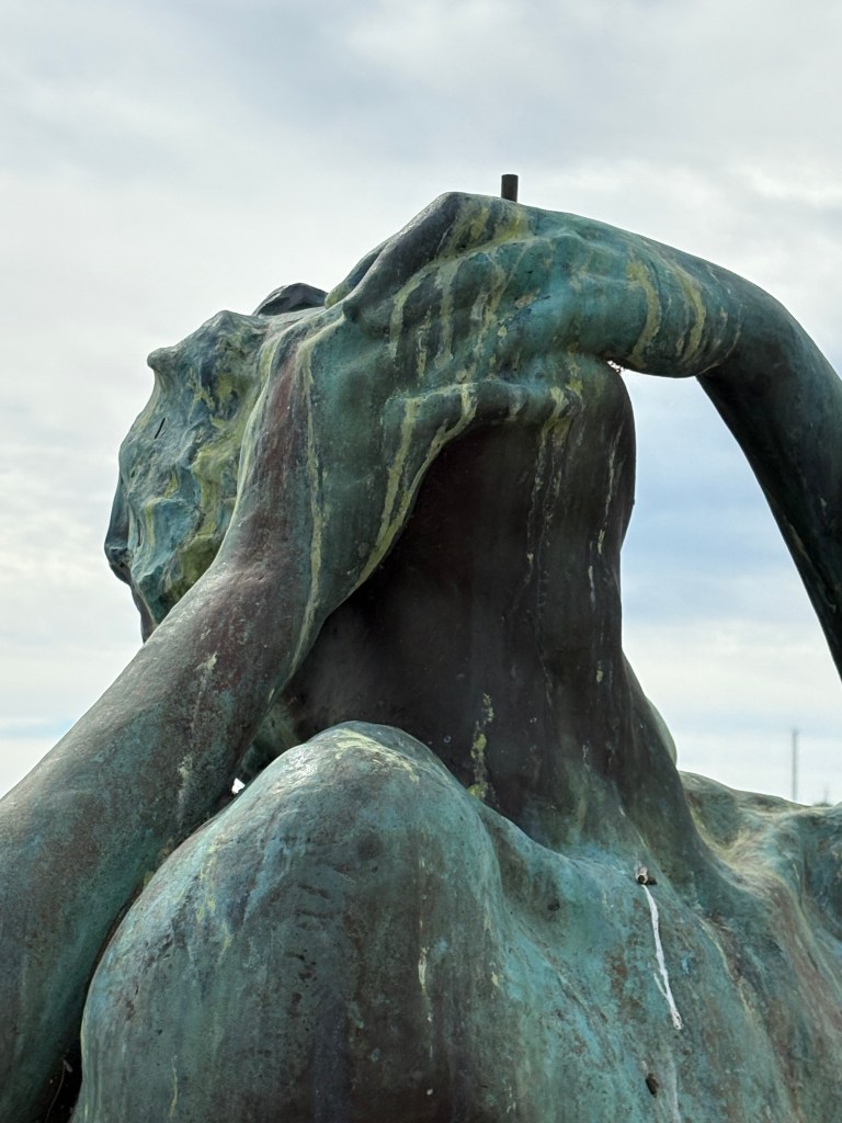 La preciosa estatua se recorta, casi dentro de las aguas, sobre un saliente rocoso al pie de una playita en la que unas cuantas sillas de madera y lona a rayas amarillas y blancas ofrecen descanso tras la sauna del balneario. Me emocionó encontrar la materia que había prefigurado las palabras de la narración. En la bahía, multitud de barcos —Miguel navega en un velero dirigido por Karin—. Las nubes esponjosas cubrían el límpido azul del cielo veraniego.