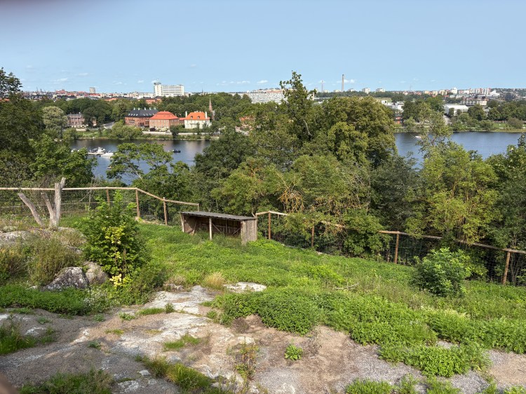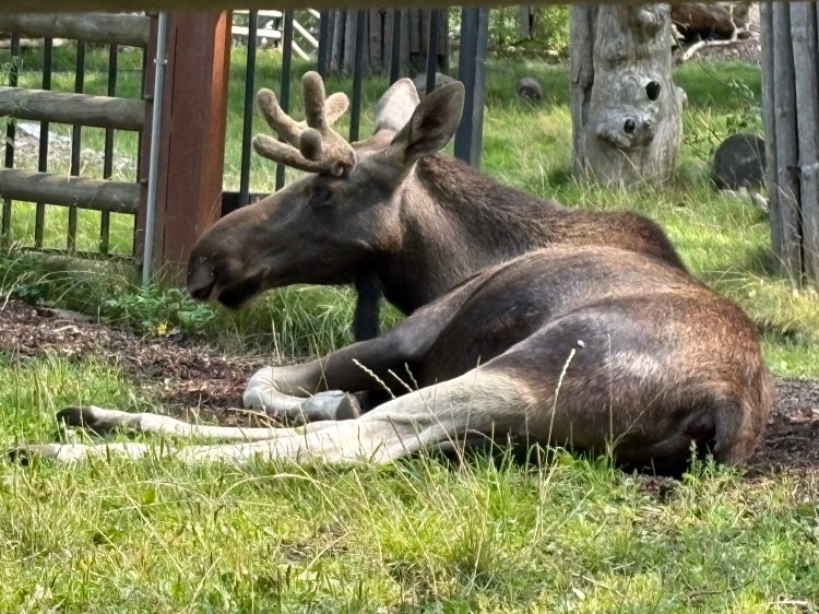 Seguí los pasos de Miguel Espejo que, al poco de su llegada, acude al parque Skansen. Alberga un zoo donde él se encuentra con un reno moribundo, que refleja su sentir interior en una vida provinciana sin alicientes dentro de una España represiva. Varias veces acude a ver al animal hasta que, en su última visita, se enfrenta al vacío, pues simplemente ha desaparecido. Me sucedió algo similar: cuando subí la colina hasta el recinto de los renos, me encontré para mi decepción con el espacio deshabitado y un cartel que anunciaba mejora en las instalaciones. Me tuve que conformar con un alce, allí tumbado a la sombra de la máxima calurosa de veintinún grados. En Skansen hay, además, unas casas antiguas de madera, traídas de distintas partes de Suecia, para mostrar la dura y corta vida de los habitantes en épocas pasadas. Chimeneas que llenaban de humo el interior, oscuridad alumbrada por palitos en los cortísimos días de invierno, escasez de verduras… En la tienda de ultramarinos del “cómodo” posterior siglo XIX un historiador ataviado con ropa de la época mostraba el valioso azúcar, las madejas de lana, el tabaco importado —como este era tan caro, decidieron plantarlo—. Fui a un pequeño Museo del Tabaco donde se contaba el proceso y también había un piso dedicado a la producción de cerillas.